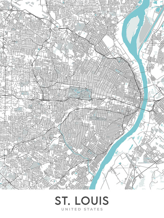 Cette carte de Saint-Louis, Missouri, est une œuvre d'art cartographique moderne et détaillée, présentant un design unique et contemporain. La carte se concentre sur la ville de Saint-Louis et ses environs, offrant une représentation précise et visuellement agréable de la géographie de la ville. La carte couvre un large éventail de quartiers, notamment Downtown, Soulard, Lafayette Square, Central West End, Tower Grove South, Shaw, Botanical Heights, Fox Park, Benton Park et The Hill. Il comprend également les routes, routes et autoroutes principales, telles que l'Interstate 44, l'Interstate 55, l'Interstate 64, l'Interstate 70, l'Interstate 270, l'US Route 40, l'US Route 61, l'US Route 67, la Missouri Route 141 et la Missouri Route 180.
