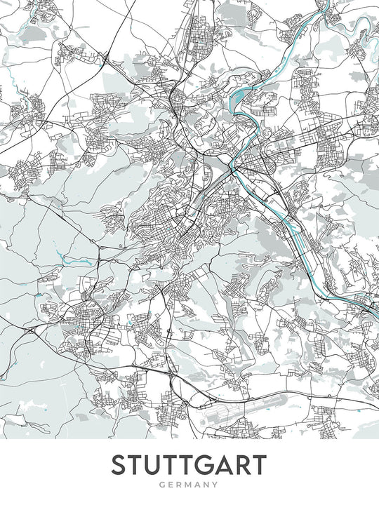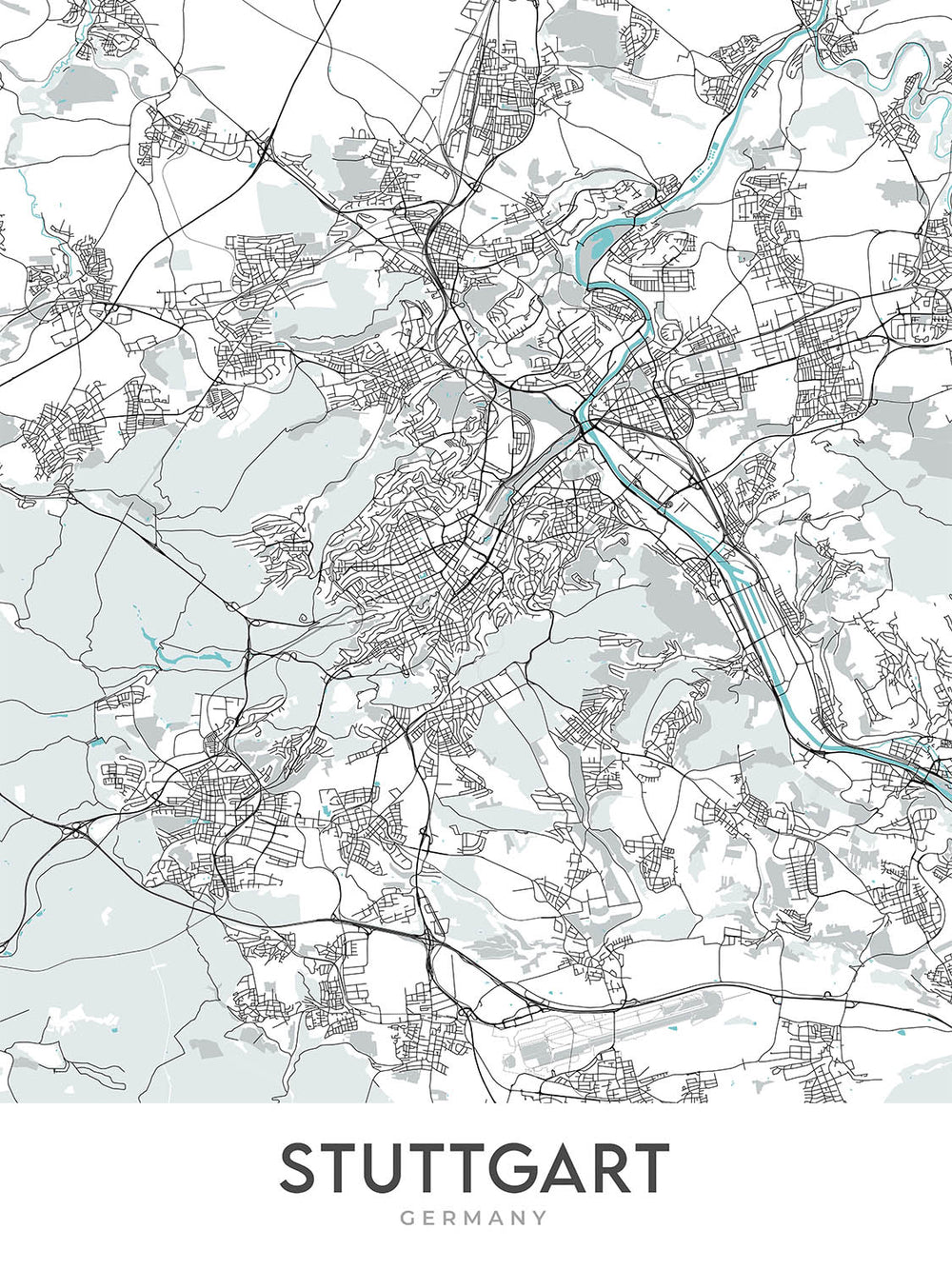 Plan de la ville moderne de Stuttgart, Allemagne : Fernsehturm, musée Mercedes-Benz, musée Porsche, Schloss Solitude, Staatsgalerie