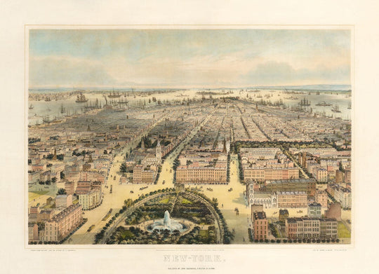 La carte regarde la ville d'un point juste au-dessus de l'Union Square et a l'air du sud-ouest vers l'endroit où le district financier est aujourd'hui. À l'époque, bien sûr, tout est tout simplement des ports, des quais et des navires. Vous pouvez clairement voir la batterie et le parc de la batterie, ce qui est une bonne touche.