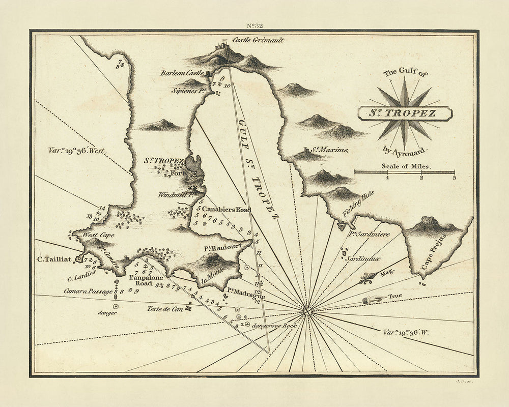 Cette carte est particulièrement remarquable pour sa représentation détaillée du golfe de Saint-Tropez, mettant en valeur non seulement la beauté naturelle du littoral, mais également des points de repère clés tels que les cabanes de pêcheurs sur les pentes de Sainte-Maxime. Ces structures modestes contrastent fortement avec les villas luxueuses qui parsèment le paysage aujourd'hui, offrant un aperçu fascinant de la transformation de cette destination désormais glamour de la Riviera. La carte comprend d'autres éléments importants tels que des sondages, des aides à la navigation et l'emplacement de divers forts et institutions religieuses, ce qui en fait une ressource inestimable pour comprendre l'histoire maritime de la région.