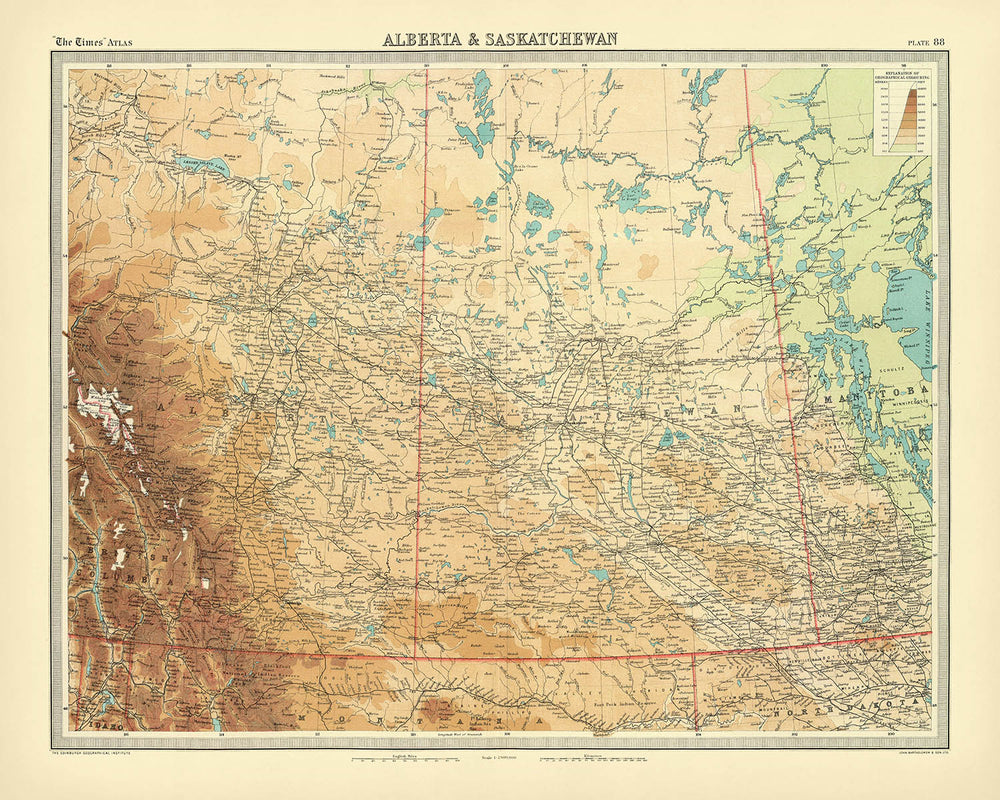 L'utilisation innovante par Bartholomew de l'ombrage de relief et des teintes hypsométriques donne vie à la carte, mettant en évidence la topographie diversifiée de la région. Les montagnes Rocheuses se dressent majestueusement le long de la bordure ouest, leurs élévations méticuleusement rendues pour capturer la grandeur de cette barrière naturelle. Les teintes bathymétriques de la carte délimitent les profondeurs de nombreux lacs et rivières, tissant une tapisserie de plans d'eau qui traversent les provinces. Cette attention aux phénomènes géographiques reflète les avancées dans les pratiques cartographiques de cette époque, rendant la carte à la fois un outil fonctionnel et une œuvre d'art.