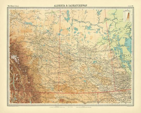 Au-delà de son détail géographique, la carte est imprégnée d'une signification historique. Elle ne trace pas seulement le paysage physique mais capture également le milieu culturel et politique de l'époque. Les frontières entre l'Alberta, la Saskatchewan et le Manitoba sont clairement définies, reflétant les limites politiques de l'époque. Cette carte est un trésor de collection pour les passionnés de cartographie historique, offrant un aperçu du passé avec chaque contour et ligne.