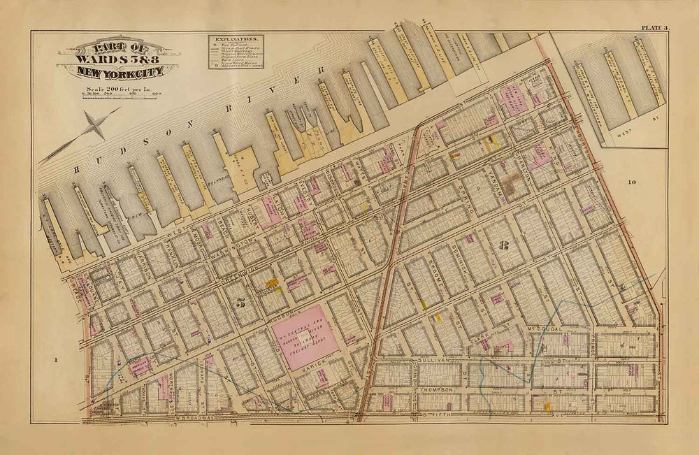 Cette carte couvre des parties des quartiers 5 et 8 des divisions municipales historiques de New York, ce qui équivaut à l'actuel Hudson Square et à la partie supérieure de Tribeca. Cette carte est délimitée par Houston St au nord, Reade St au sud et Broadway à l'est.