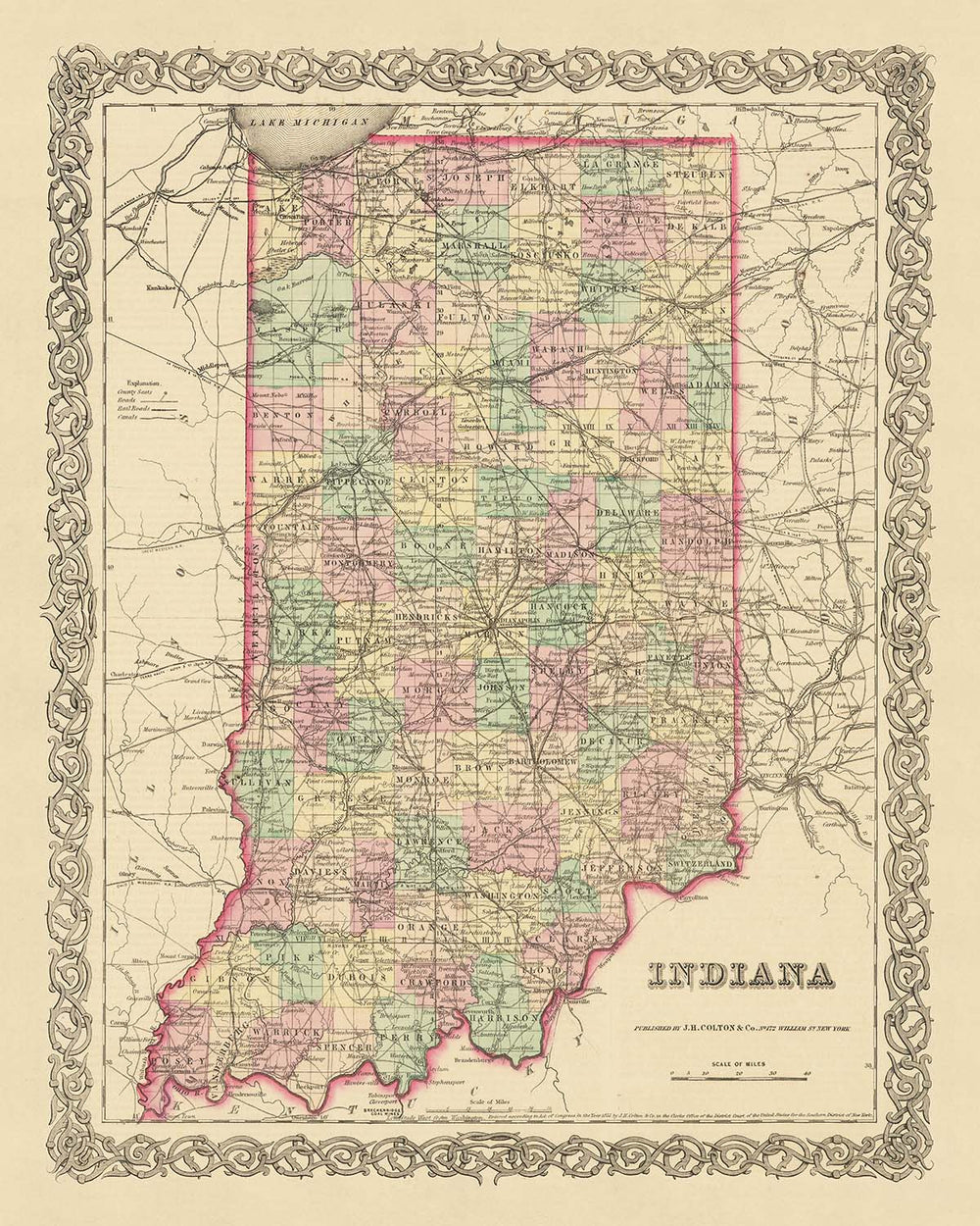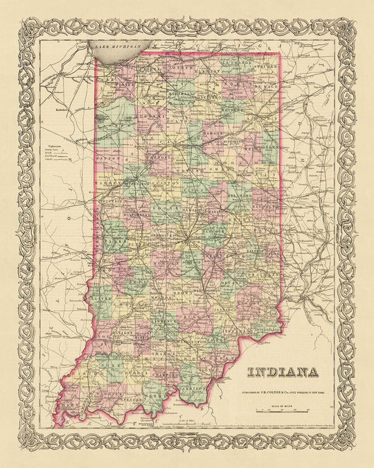 Le travail de JH Colton, largement considéré comme le meilleur cartographe américain de son époque, se caractérise par son attention exceptionnelle aux détails et à la précision. Cette carte ne fait pas exception. Il comprend les cinq colonies les plus remarquables de l'Indiana à l'époque : Indianapolis, la capitale de l'État et une plaque tournante clé du commerce et des transports ; Fort Wayne, un avant-poste vital à la frontière ; New Albany, une ville fluviale prospère ; Terre Haute, connue pour ses riches ressources naturelles ; et Lafayette, un centre animé de commerce et d'industrie.