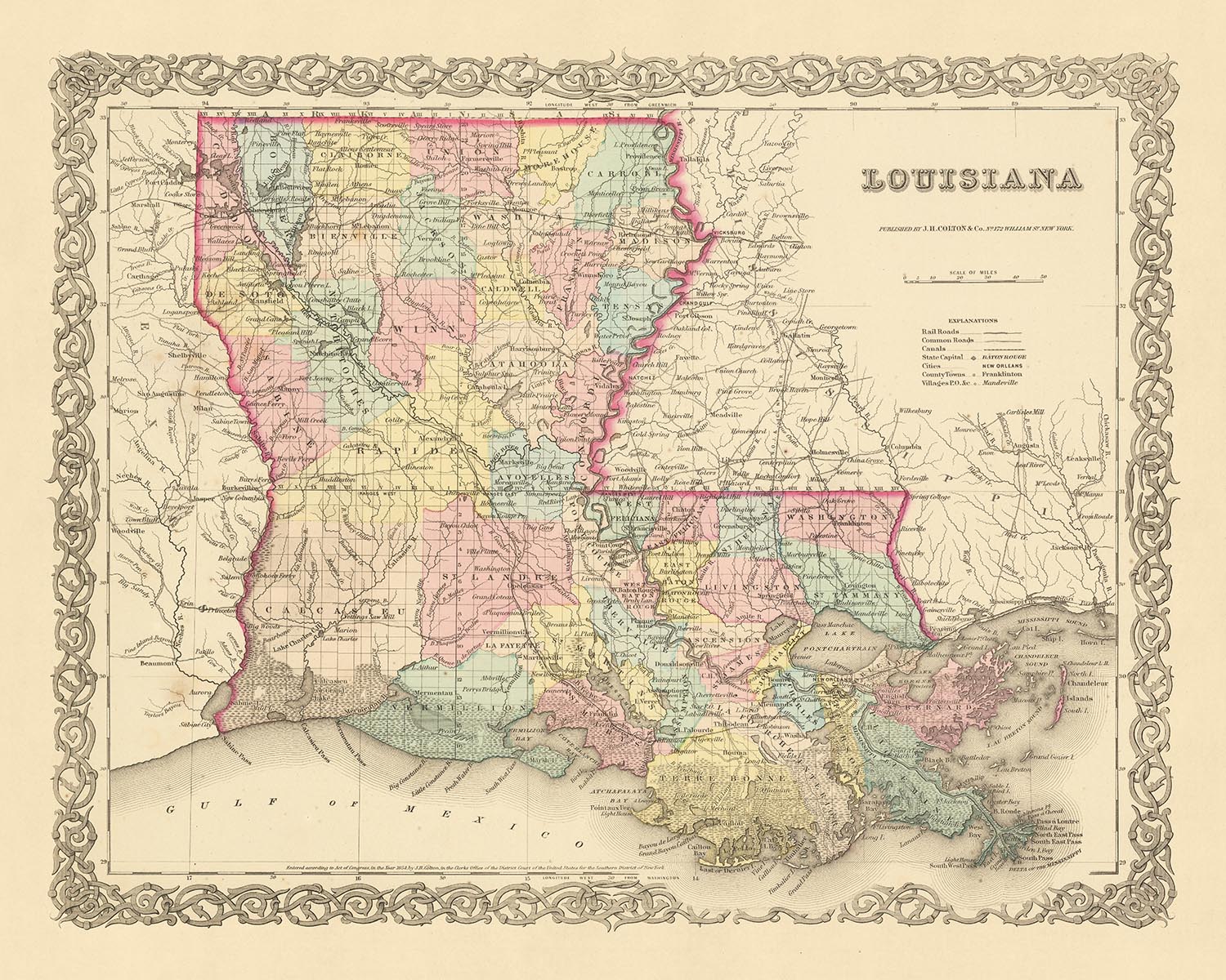 Cette carte offre un instantané unique de la Louisiane en 1855, une période de changement et de croissance importants. Il offre un aperçu fascinant du développement de la région, mettant en lumière cinq des colonies les plus remarquables de l'époque : la Nouvelle-Orléans, Baton Rouge, Shreveport, Lafayette et Lake Charles. Chacune de ces colonies a joué un rôle crucial dans l’histoire de l’État et leur importance sur la carte souligne leur importance à cette époque.