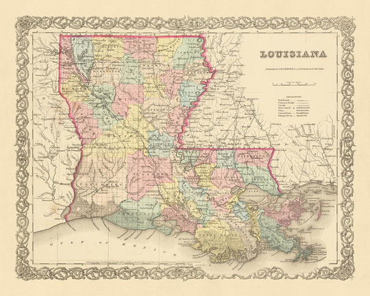 Vivez le frisson de la découverte en parcourant les détails complexes de cette carte, révélant les histoires du passé de la Louisiane. Que vous soyez un collectionneur chevronné ou simplement un amoureux de l'histoire, cette ancienne carte de la Louisiane de JH Colton saura captiver et inspirer. C'est plus qu'une simple carte : c'est un voyage dans le passé, un lien tangible avec l'histoire des États-Unis.
