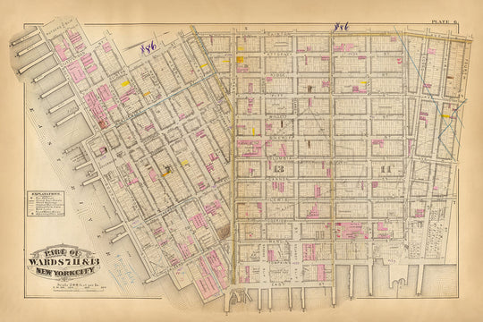 Présentant un document cartographique exquis de la fin du XIXe siècle, cette carte lithographiée coloriée à la main présente une représentation détaillée de parties des quartiers 7, 11 et 13 de la ville de New York, couvrant spécifiquement une zone du Lower East Side historique. Publiée en 1879 par GW Bromley, cette carte est une riche archive visuelle de la vie urbaine au cours d'une période de transformation de l'histoire de la ville.