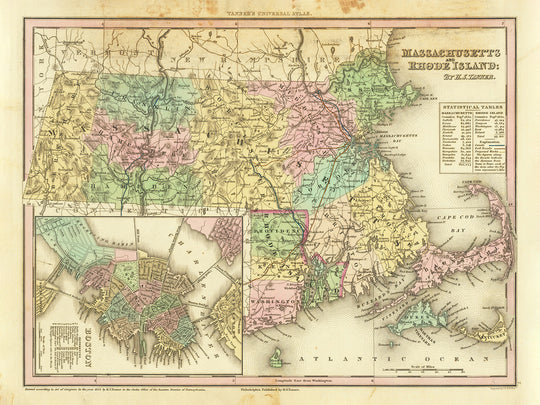Ancienne carte du Massachusetts et du Rhode Island par H. S. Tanner, 1836: Boston, Worcester, Providence, Springfield, Cambridge