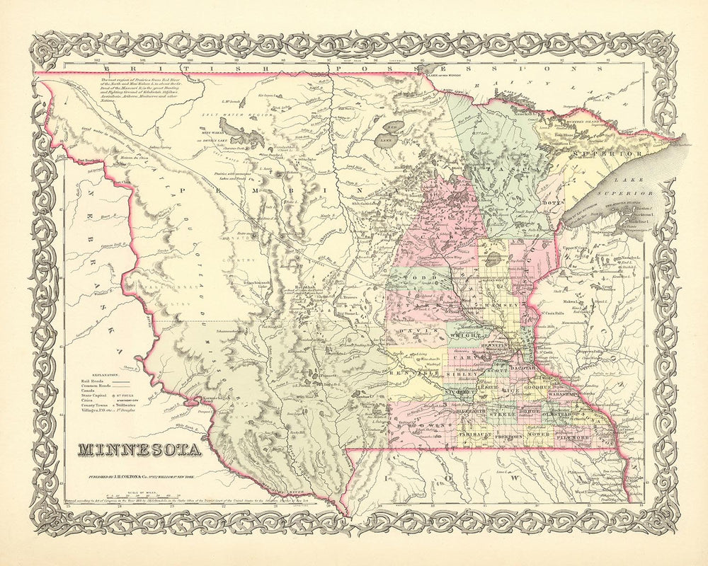 Le cartographe JH Colton est réputé pour son attention méticuleuse aux détails et son engagement envers l'exactitude. Ses cartes sont plus que de simples outils de navigation ; ce sont des œuvres d'art, chacune témoignant de son savoir-faire et de son dévouement. Cette carte du Minnesota ne fait pas exception. Chaque ligne, chaque marquage témoigne de l'engagement de Colton envers son métier.