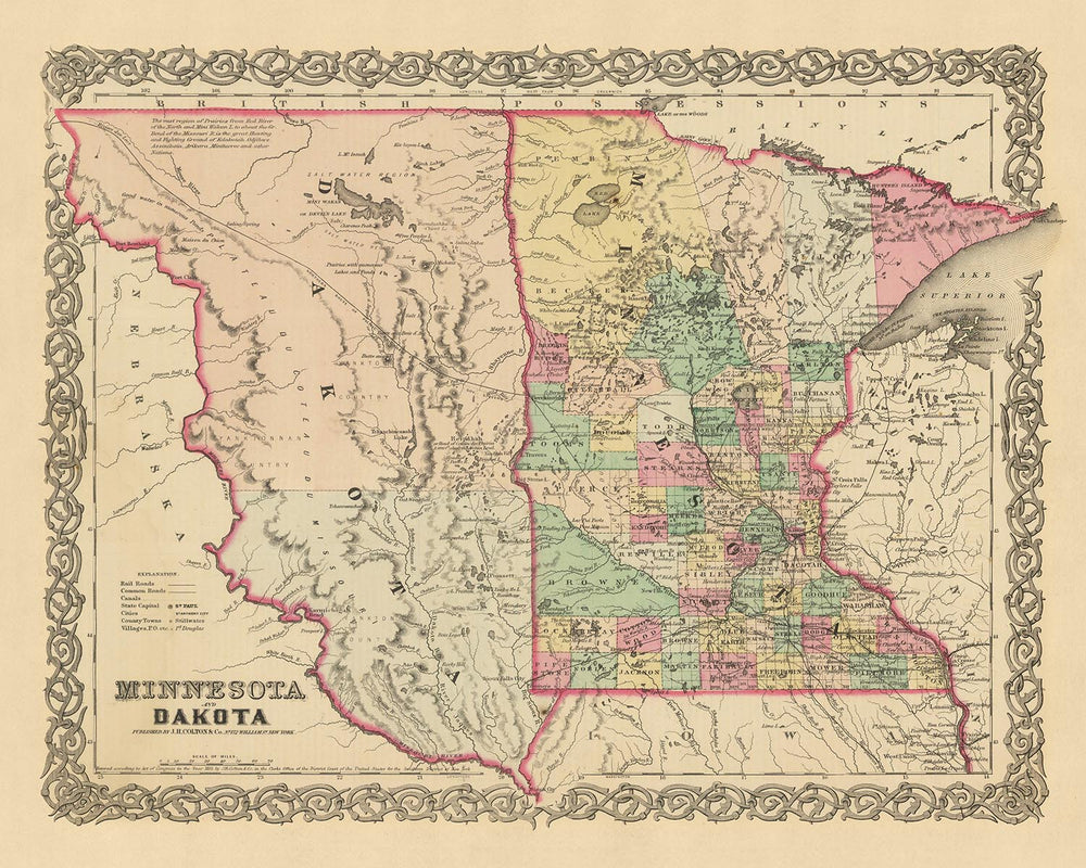 Ancienne carte du Minnesota et du Dakota par Colton, 1860: Saint-Paul, Minneapolis, Saint-Anthony, Mendota et Pembina