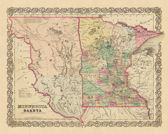 Cette carte revêt une importance historique, non seulement en tant que représentation du Minnesota et du Dakota au milieu du XIXe siècle, mais également en tant que témoignage des prouesses cartographiques de Colton. Il a été créé à une époque où les États-Unis en étaient encore à leurs balbutiements et où de nombreuses colonies n’avaient pas encore été fondées. Les caractéristiques géographiques, les noms et les frontières représentés sur cette carte ont probablement subi des changements importants depuis 1860, ce qui en fait un artefact fascinant pour les historiens, les cartographes et toute personne s'intéressant au passé.