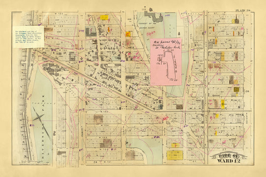 "Part of Ward 12, New York City", une carte exquise réalisée par l'éminent GW Bromley en 1879, offre un aperçu fascinant du tissu urbain de New York à la fin du XIXe siècle. Cette carte des rues de la ville méticuleusement détaillée capture l'essence d'une métropole en évolution rapide, mettant en valeur la disposition complexe des rues, des terrains et des bâtiments qui définissaient le Ward 12. L'élégance dessinée à la main de la carte et les sections à code couleur offrent une représentation vivante des zones résidentielles, commerciales et institutionnelles, ce qui en fait un artefact captivant pour les historiens et les passionnés d'urbanisme.