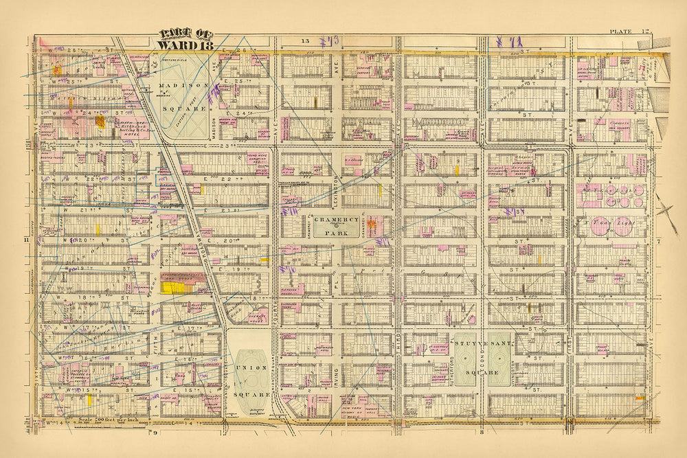 Ancienne carte du quartier 18 de la ville de New York par Bromley, 1879 : Madison Square, Gramercy Park, Stuyvesant Square, Union Square, Tammany Hall