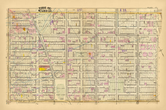Cette carte méticuleusement détaillée, coloriée à la main et lithographiée, a été publiée par GW Bromley en 1879, fournissant un instantané historique du quartier 18 de la ville de New York. À cette époque, la carte aurait été un outil essentiel pour les autorités municipales, les résidents et les entreprises. , offrant un aperçu du paysage urbain, depuis les empreintes des bâtiments jusqu'à l'emplacement des bouches d'incendie et des conduites d'eau. Sa représentation des rues, des voies ferrées et des places publiques reflète non seulement l’espace physique mais aussi le dynamisme de la vie urbaine de New York au XIXe siècle.