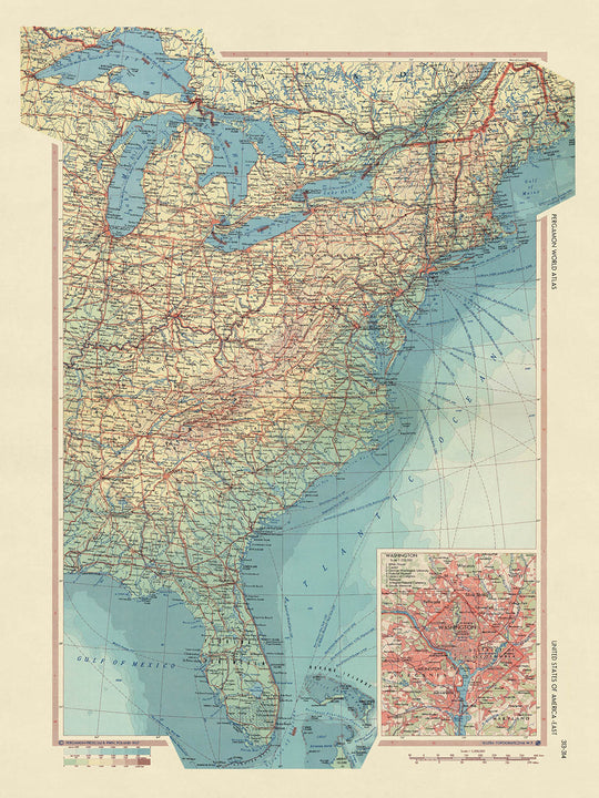 Ancienne carte des États-Unis de l'Est, 1967: New York, Chicago, Washington D.C., Grands Lacs, fleuve Mississippi