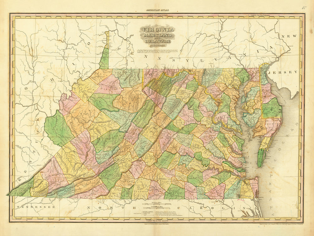 Ancienne carte de la Virginie, du Delaware, du Maryland et de Washington D.C. par H. S. Tanner (1820): Avec Baltimore, Alexandria, Norfolk, Richmond et Wilmington.