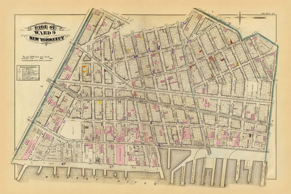 Cette remarquable carte de 1879, centrée sur la partie West Village de Greenwich Village, à New York, est une pièce lithographiée coloriée à la main par GW Bromley. Il sert de représentation détaillée de cette partie particulière de la ville à la fin du XIXe siècle. La carte illustre une zone urbaine dynamique, riche en bâtiments résidentiels et commerciaux, soigneusement délimitée pour refléter le tissu architectural de l'époque. Le code couleur indique les matériaux de construction, les tons roses suggérant des structures en brique, caractéristique de la construction de l'époque.