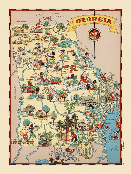 Ce qui distingue véritablement cette carte, c'est sa capacité à mélanger le contexte historique avec l'expression artistique. Créée pendant la Grande Dépression, elle offre un aperçu de l'optimisme et de la résilience de l'époque, même si elle caricature doucement les coutumes et les costumes des habitants de la Géorgie. Les scènes ludiques de la carte—la pêche, la chasse et les festivités rurales—sont équilibrées par une attention respectueuse aux réalités démographiques et économiques de l'État. Bien qu'elle ne labelle pas spécifiquement les parcs nationaux ou les sites historiques, les illustrations de la carte évoquent la beauté naturelle et la richesse culturelle qui définissent la Géorgie.