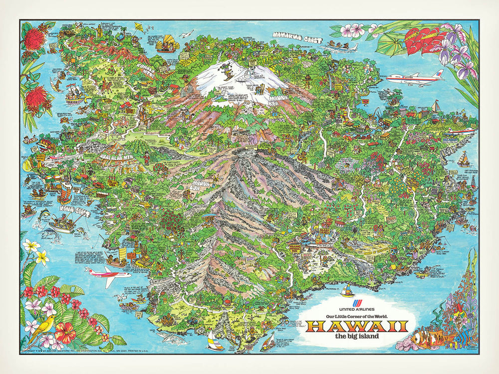 La carte met en valeur les monuments emblématiques de la Grande Île, y compris le majestueux Mauna Kea et Mauna Loa, ainsi que le volcan Kilauea toujours actif. Ces merveilles naturelles sont représentées avec des couleurs vives et des détails complexes, invitant les spectateurs à apprécier les merveilles géologiques de l'île. La carte souligne également les côtes pittoresques de Kona et Hamakua, où les eaux azurées rencontrent des paysages luxuriants, offrant un aperçu de la beauté naturelle diversifiée de l'île.