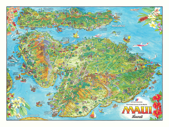 La carte "Maui United Airlines Our Little Corner of the World", conçue par Kim Forrest en 1979, est une représentation vibrante des îles hawaïennes, se concentrant spécifiquement sur Maui et Molokai. Cette carte picturale était à l'origine un article promotionnel pour United Airlines, conçue pour captiver les voyageurs avec ses illustrations vives et son charme fantaisiste. La carte n'est pas seulement une représentation géographique mais un voyage visuel à travers les merveilles culturelles et naturelles de ces îles enchanteuses. Ses images colorées invitent les spectateurs à explorer les paysages luxuriants et le riche patrimoine d'Hawaï, en faisant une pièce fascinante pour les collectionneurs et les passionnés.