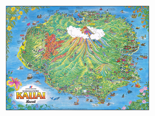 Le design d'Olson est une célébration colorée de la beauté naturelle et du riche patrimoine culturel de Kauai. Les images ludiques de la carte donnent vie aux sites emblématiques de l'île, tels que les falaises dramatiques de la côte Na Pali et l'immense étendue du canyon de Waimea. Chaque illustration est méticuleusement détaillée, invitant les spectateurs à explorer les paysages luxuriants et les trésors cachés de Kauai. Le style vibrant reflète l'attrait de l'île, en faisant une pièce parfaite pour ceux qui apprécient à la fois l'art et l'histoire.