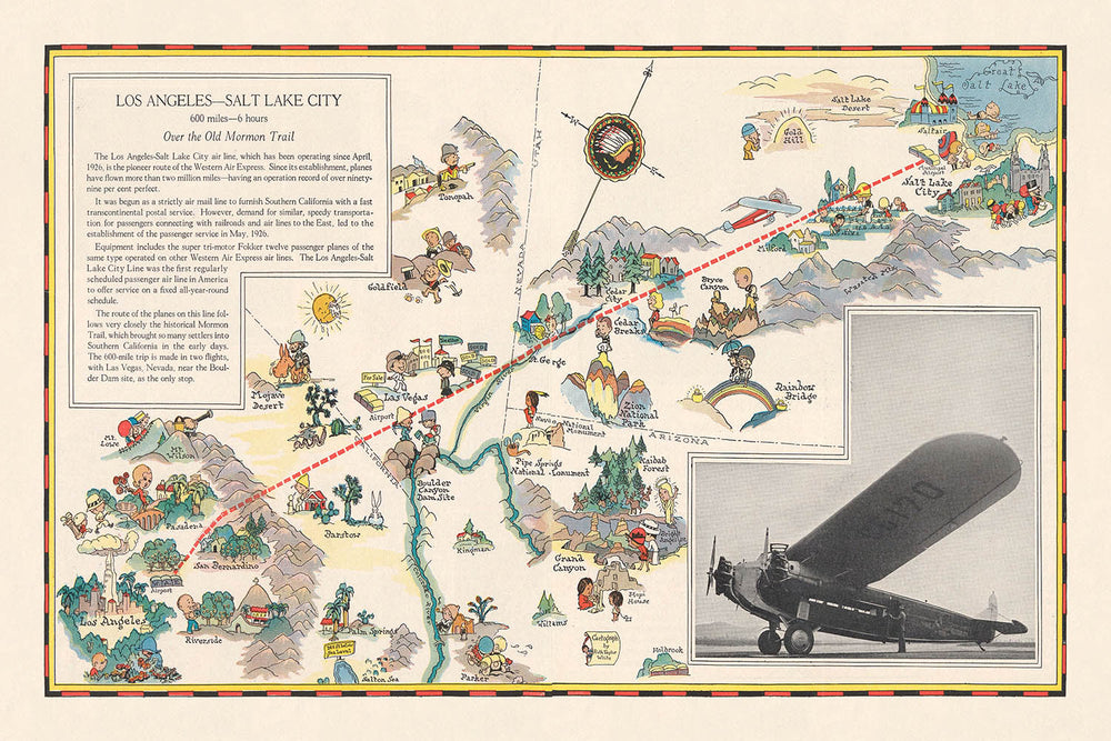 Carte picturale de la route aérienne Los Angeles–Salt Lake City, 1929: Western Air Express, Fokker tri-moteur, Las Vegas, Grand Lac Salé, Parc national de Zion
