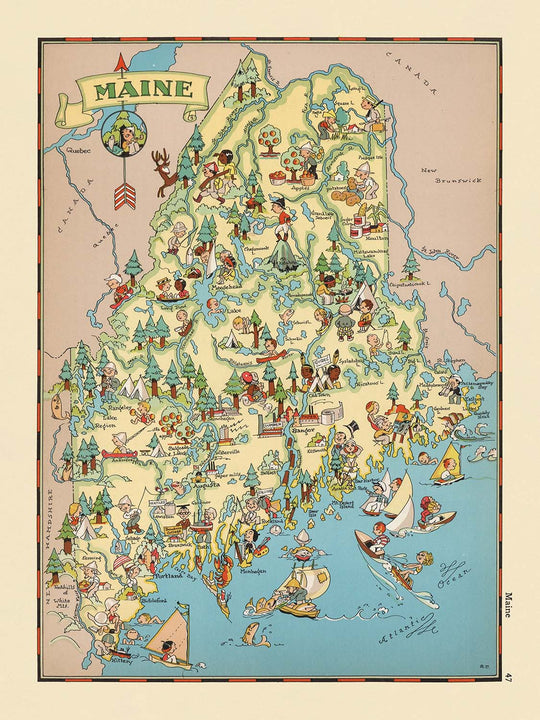Le design de la carte est une leçon magistrale en cartographie thématique et picturale. Les limites des comtés sont clairement délimitées, tandis que les caractéristiques les plus significatives de l'État sont mises en vie à travers des illustrations fantaisistes. Les bûcherons s'affairent dans les vastes forêts du nord, un clin d'œil à l'industrie forestière légendaire du Maine, tandis que les pêcheurs et les pêcheurs de homards naviguent le long de la côte atlantique escarpée, soulignant l'importance durable de la vie maritime. Les champs fertiles du comté d'Aroostook sont célébrés par des images de culture de pommes de terre, et la richesse naturelle de l'État est davantage mise en valeur par des représentations de bleuets, d'élans et de forêts denses. Chaque illustration sert à la fois de point d'éducation et de célébration des paysages diversifiés du Maine.