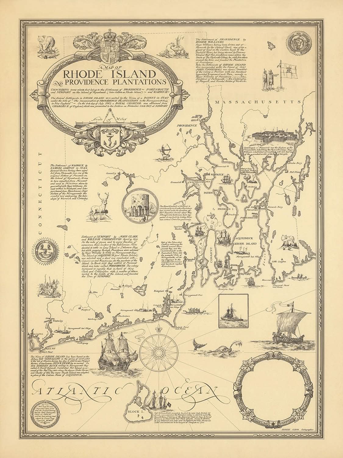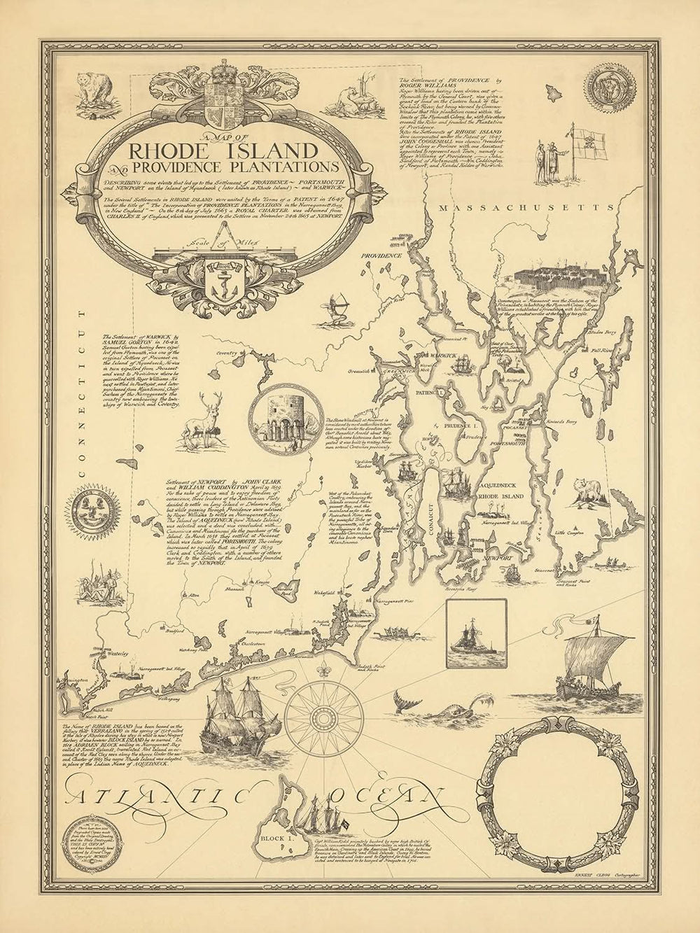 La carte couvre l'intégralité de Rhode Island, s'étendant jusqu'à certaines parties du Massachusetts et du Connecticut, avec l'océan Atlantique magnifiquement rendu le long de sa bordure orientale. Elle présente le littoral détaillé de Rhode Island, mettant en valeur ses baies, ses criques et ses îles. Une carte en médaillon de Block Island ajoute de la profondeur à la représentation géographique. L'orientation thématique de la carte est évidente dans l'inclusion d'annotations historiques et de représentations artistiques de personnages amérindiens, de colonies coloniales et des premiers explorateurs, offrant une fenêtre sur le passé.