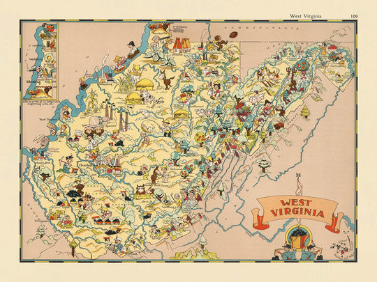 - Richement ornée d'images et d'illustrations vibrantes, de style bande dessinée, qui reflètent la culture, les industries et les stéréotypes de la Virginie-Occidentale dans les années 1930
