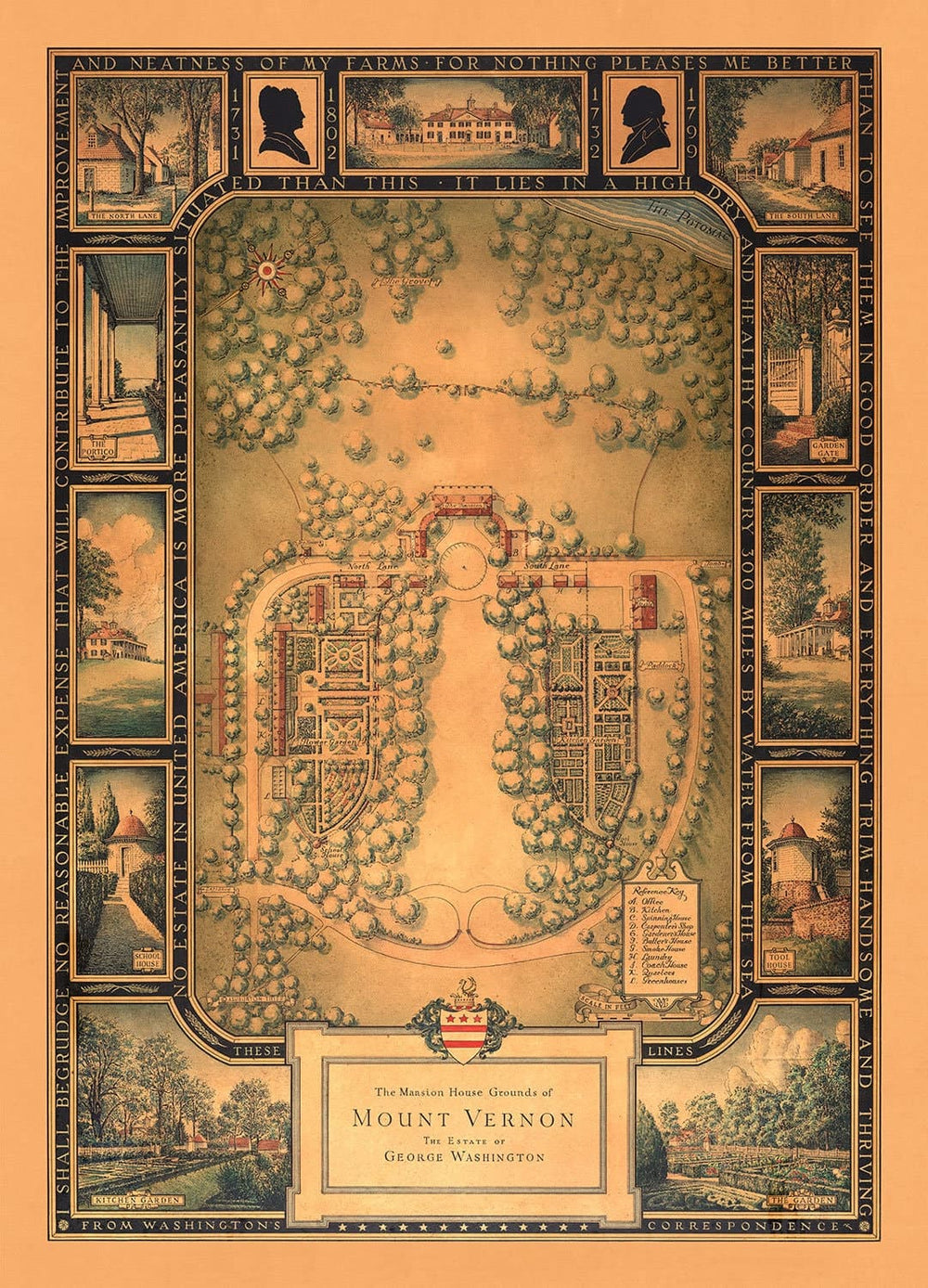 Autour de la carte se trouve une citation d'une lettre que Washington a envoyée au gestionnaire de Mount Vernon : "Je ne rechignerai à aucun frais raisonnable qui contribuera à l'amélioration et à la propreté de mes fermes, car rien ne me plaît davantage que de les voir en bon état, et tout bien taillé, beau et prospère."