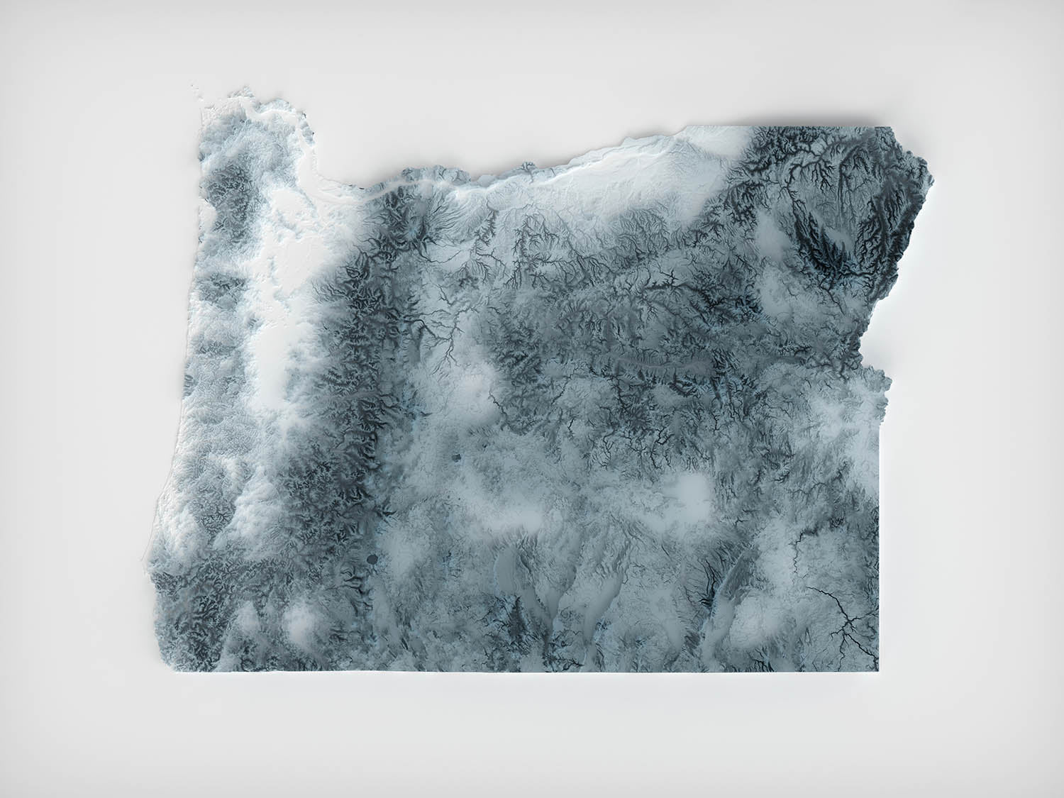 À l'ouest, les douces ondulations de la vallée de Willamette offrent un contrepoint frappant, montrées comme un large bassin fertile bercé entre les flancs des montagnes—un cœur tranquille entre des crêtes surélevées. Les montagnes côtières s'élèvent brusquement de la frontière étroite du Pacifique, leurs contours tracés par un ombrage subtil qui met en valeur chaque crête et chaque creux, faisant écho aux rivages sauvages et aux criques cachées de l'Oregon.