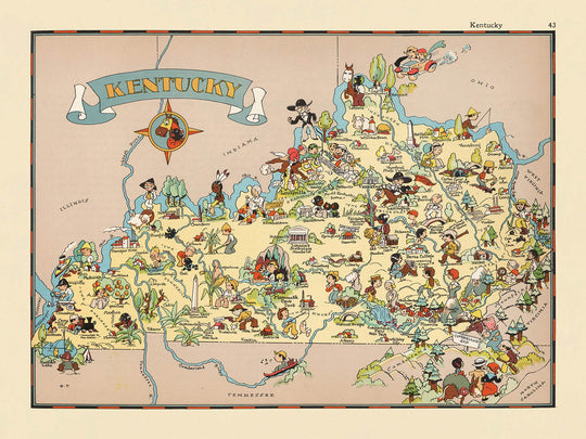Entrez dans le monde vibrant de l'Amérique des années 1930 avec « Kentucky », le titre original de cette carte picturale captivante créée par Ruth Taylor White en 1935. Bien plus qu'une simple référence géographique, cette carte est une célébration du caractère unique du Kentucky, rendu dans un style fantaisiste et cartoon qui attire immédiatement l'œil. Chaque comté est délimité et étiqueté, mais c'est le déferlement d'illustrations colorées — représentant tout, des courses de chevaux animées aux bateaux à vapeur animés — qui donne vraiment vie à l'État de Bluegrass. La bordure décorative de la carte et le cartouche du titre ajoutent une touche d'élégance ludique, en faisant une fusion délicieuse d'art et de tradition cartographique.