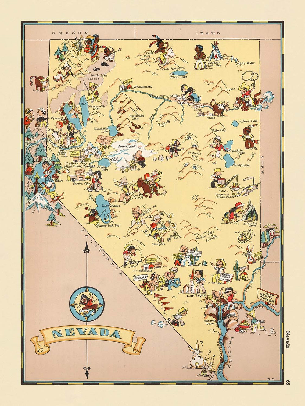 Carte picturale du Nevada par Ruth Taylor White, 1935: Las Vegas, Reno, Carson City, Mines, Chemins de fer