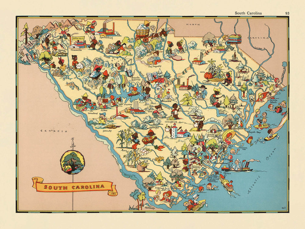 Carte picturale de la Caroline du Sud par Ruth Taylor White, 1935: Columbia, Charleston, Greenville, Côte Atlantique, frontières des comtés