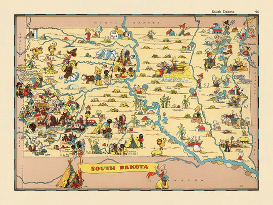- But artistique : La carte utilise des illustrations charmantes et humoristiques pour capturer l'esprit, la culture et les stéréotypes du Dakota du Sud tels qu'ils étaient perçus dans les années 1930.