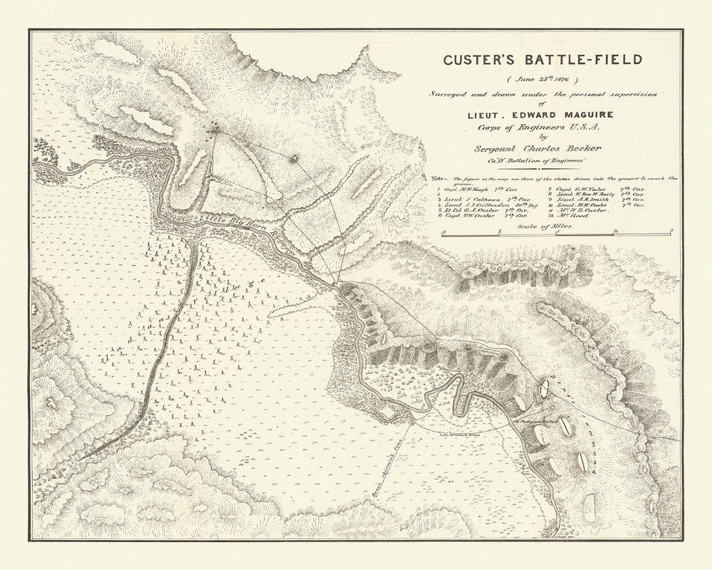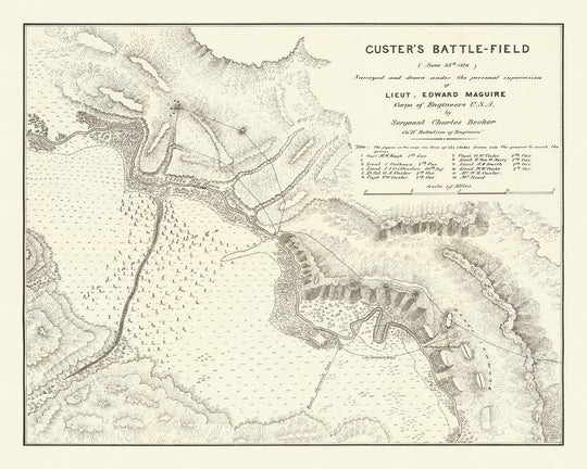 Le Corps des ingénieurs de l'armée américaine, chargé à la fois de la cartographie militaire stratégique et des levés topographiques pendant la période post-guerre civile, a acquis une renommée durable pour des œuvres telles que celle-ci en raison de leur précision minutieuse et de leur attention à la conséquence historique. La carte a été dessinée sous la direction technique du lieutenant Maguire et artistiquement réalisée par le sergent Charles Becker, mettant en avant leur expertise combinée dans la science et l'art de la cartographie de champ de bataille. En enregistrant chaque détail significatif, y compris les contours des rivières, les caractéristiques topographiques et les positions des troupes marquées, leur travail a fourni des aperçus critiques sur l'issue dramatique de la Grande Guerre Sioux de 1876.