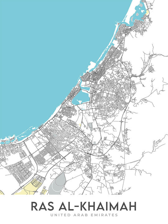 La carte est soigneusement élaborée avec une attention particulière aux détails, garantissant que chaque rue, monument et quartier est représenté avec précision. Le résultat est une carte visuellement époustouflante et informative qui fournit un aperçu complet de la ville. Que vous soyez un résident local, un touriste ou simplement quelqu'un qui apprécie les belles cartes, cette carte de Ras Al Khaimah est un incontournable pour votre collection.