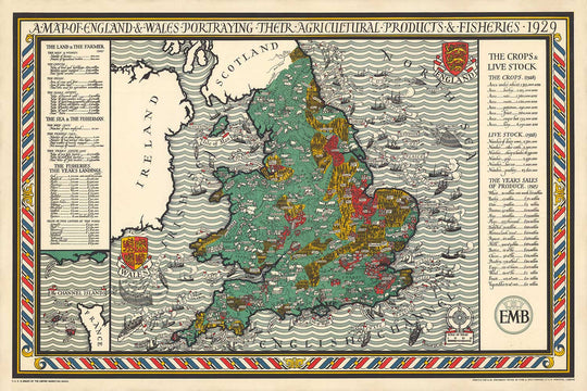 Cette merveilleuse vieille carte de l'Agriculture et des Pêches d'Angleterre et du Pays de Galles a été publiée pour la première fois en 1928. Elle a été créée par Macdonald Gill.