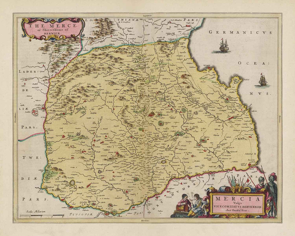 Cette carte ancienne en couleur complète, extrêmement rare, du comté de Berwick en Écosse a été créée par le maître cartographe Joan Blaeu depuis son atelier à Amsterdam et publiée à l'origine en 1665 dans le cadre de son Theatrum Orbis Terrarum Sive Atlas Novus.