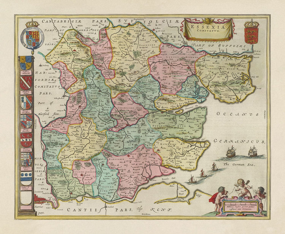Ancienne carte de l'Essex, 1665 par Joan Blaeu: Southend, Colchester, Chelmsford, Basildon, Romford, Braintree, North London