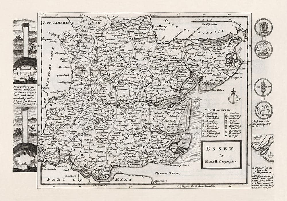 Ancienne carte d'Essex 1724, par Herman Moll: Southend, Colchester, Chelmsford, Basildon, Romford