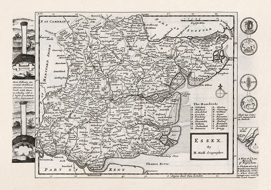 Ceci est une ancienne carte du comté d'Essex en 1724, mis en place par un cartographe expert et une graveur Herman Moll, peut-être le mappiste le plus terrestre et le plus important du 18ème siècle.