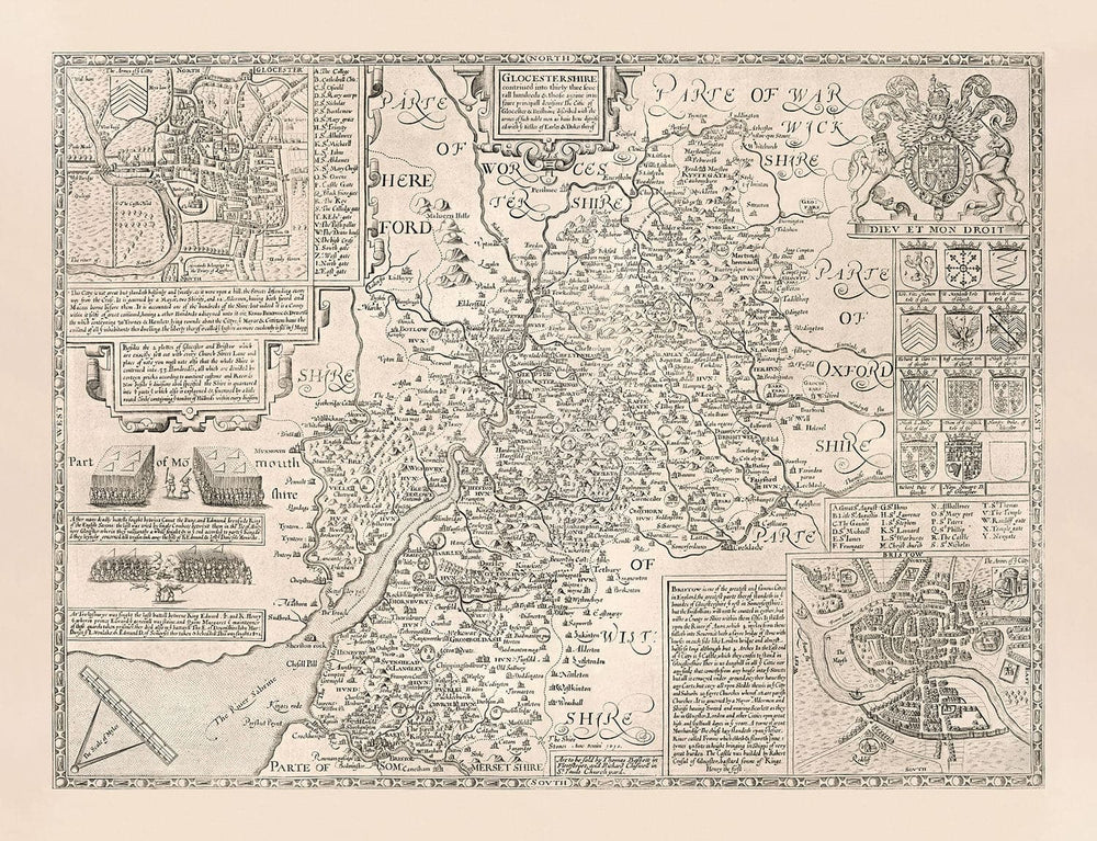 De nombreuses villes, villages et cités du Gloucestershire sont déjà visibles sur cette carte. En 1611, le Gloucestershire était un peu plus grand. Aujourd'hui, le South Gloucestershire et Bristol ont été séparés, et certaines des étendues nord sont devenues le Warwickshire.