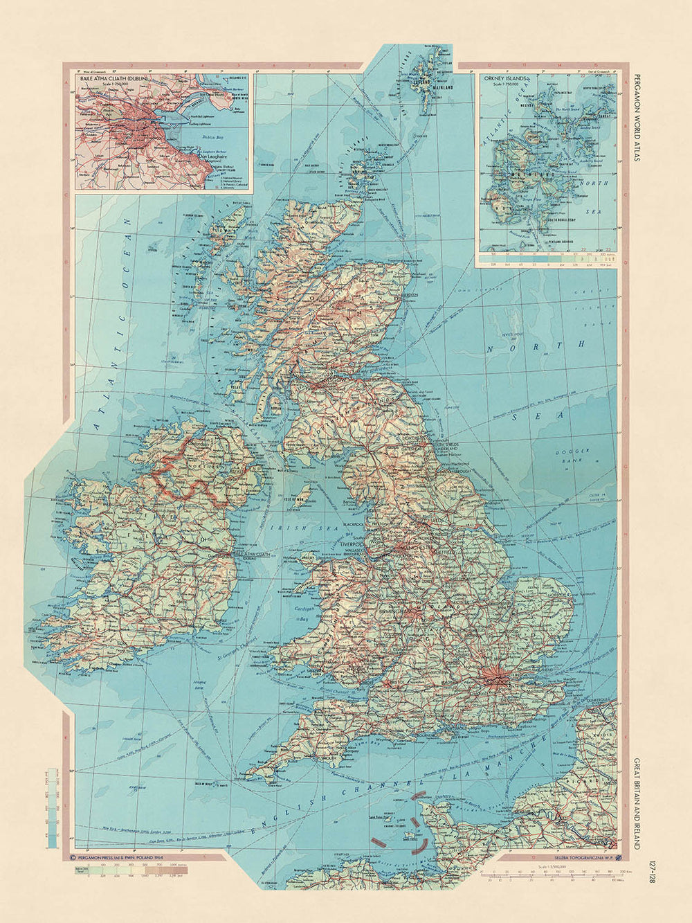 Cette carte de 1967 de la Grande-Bretagne et de l'Irlande réalisée par le service topographique de l'armée polonaise est une carte politique et physique détaillée qui fournit un aperçu complet des îles britanniques. La carte est centrée sur les îles britanniques, avec les pays environnants, à savoir la France, la Belgique, les Pays-Bas, le Danemark, la Norvège, la Suède et l'Islande, représentés dans des cartes en médaillon. La carte comprend également des encarts détaillés de Dublin (Baile Atha Cliath) et des îles Orcades.