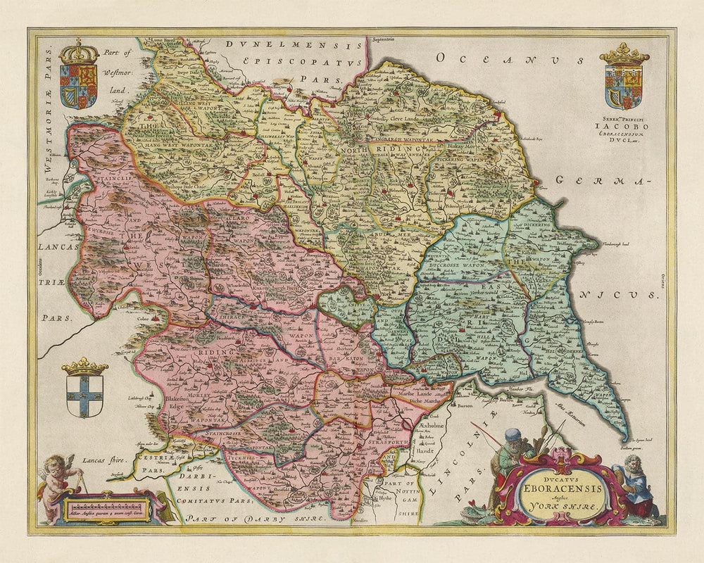 Ceci est une carte ancienne en couleur pleine de Yorkshire extrêmement rare, créée par le maître cartographe Joan Blaeu depuis son atelier à Amsterdam et publiée à l'origine dans ce Theatrum Orbis Terrarum Sive Atlas Novus en 1654.