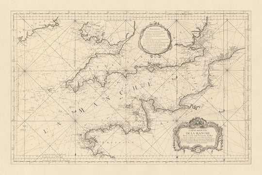 La "Carte Réduite de la Manche" n'est pas simplement un outil de navigation mais un document historique qui offre une fenêtre sur le paysage géopolitique du XVIIIe siècle. Il décrit minutieusement la côte sud des îles britanniques et la côte nord de la France, en mettant uniquement en valeur les villes côtières, notamment les capitales animées de Londres et Paris. La carte est encore enrichie par l'étiquetage des comtés et régions clés tels que le Sussex, le Dorset, le Devon, les Cornouailles, la Normandie, la Bretagne, la Picardie et la Flandre. Cette sélection minutieuse de détails donne un aperçu des domaines d'importance stratégique et de navigation à une époque où le contrôle des mers était essentiel à la puissance nationale et à l'expansion coloniale.