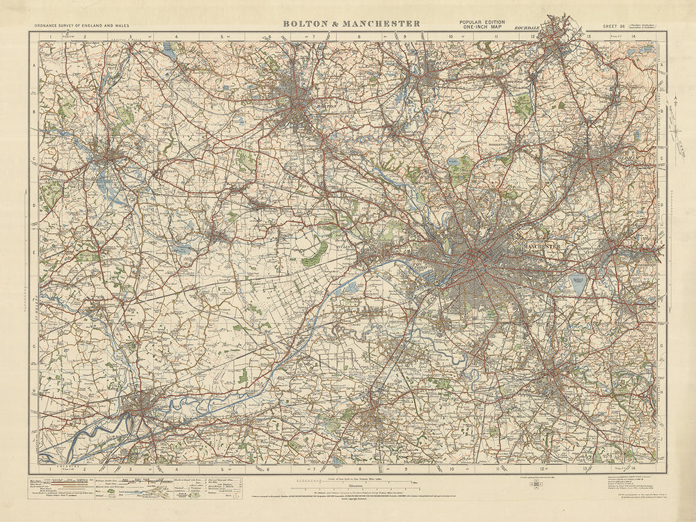Carte Old Ordnance Survey, feuille 36: Bolton et Manchester, 1925 : Warrington, Wigan, Oldham, Rochdale, Bury