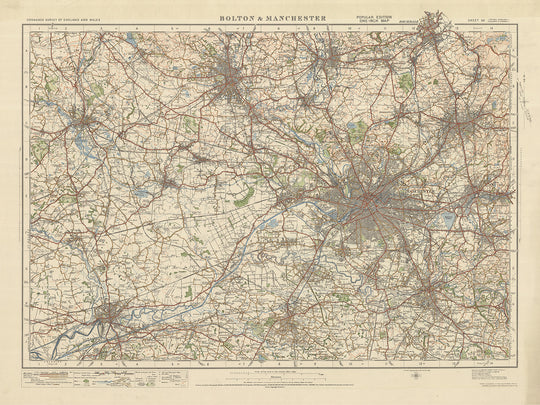 La carte Old Ordnance Survey, feuille 36 - Bolton & Manchester, 1925 est un morceau remarquable de l'histoire cartographique qui offre un aperçu fascinant du passé. Cette carte, qui fait partie de l'édition « Populaire » d'un pouce pour l'Angleterre et le Pays de Galles, présente les villes de Bolton et de Manchester, ainsi que plusieurs autres établissements et caractéristiques importants de la région environnante.