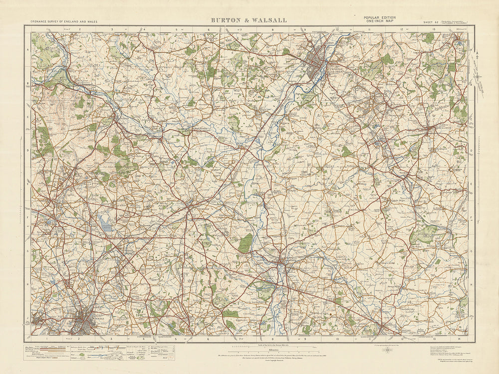 Carte Old Ordnance Survey, feuille 62: Burton & Walsall, 1925 : Cannock, Lichfield, Tamworth, Rugeley, Cannock Chase AONB