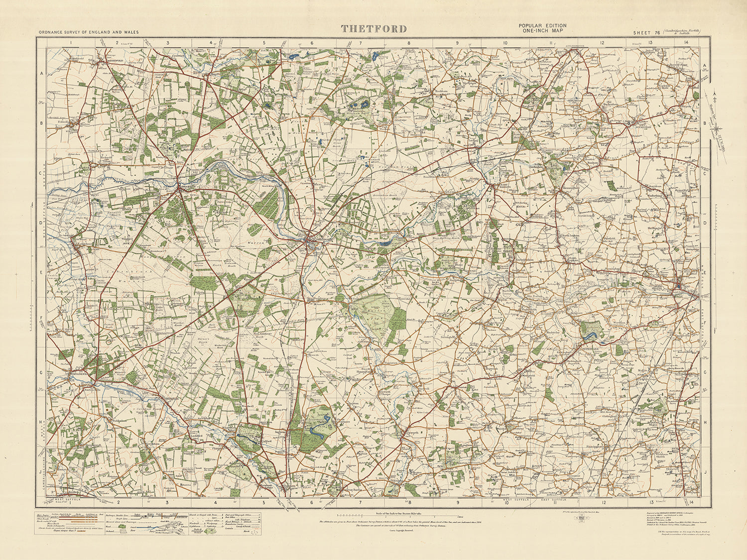 Cette ancienne carte, intitulée « Feuille 76 - Thetford », fait partie de l'édition « populaire » d'un pouce de l'Ordnance Survey pour l'Angleterre et le Pays de Galles, publiée en 1925. Elle présente les villes et les caractéristiques intéressantes de Thetford et de ses environs. zones. La carte couvre une vaste région, offrant un aperçu fascinant du paysage et des établissements de l’époque.